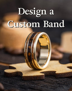 Here's a peek at a design we created called The Gold Rush. It features authentic teak wood from the USS California battleship, a 14K solid yellow gold band, with a custom engraving.