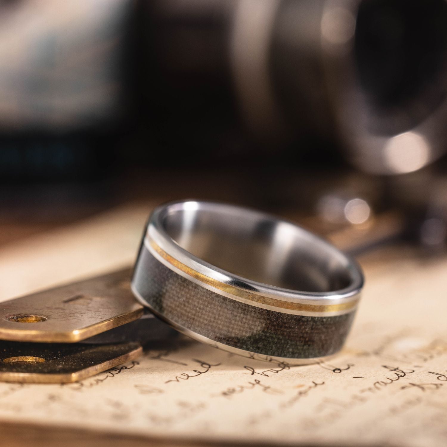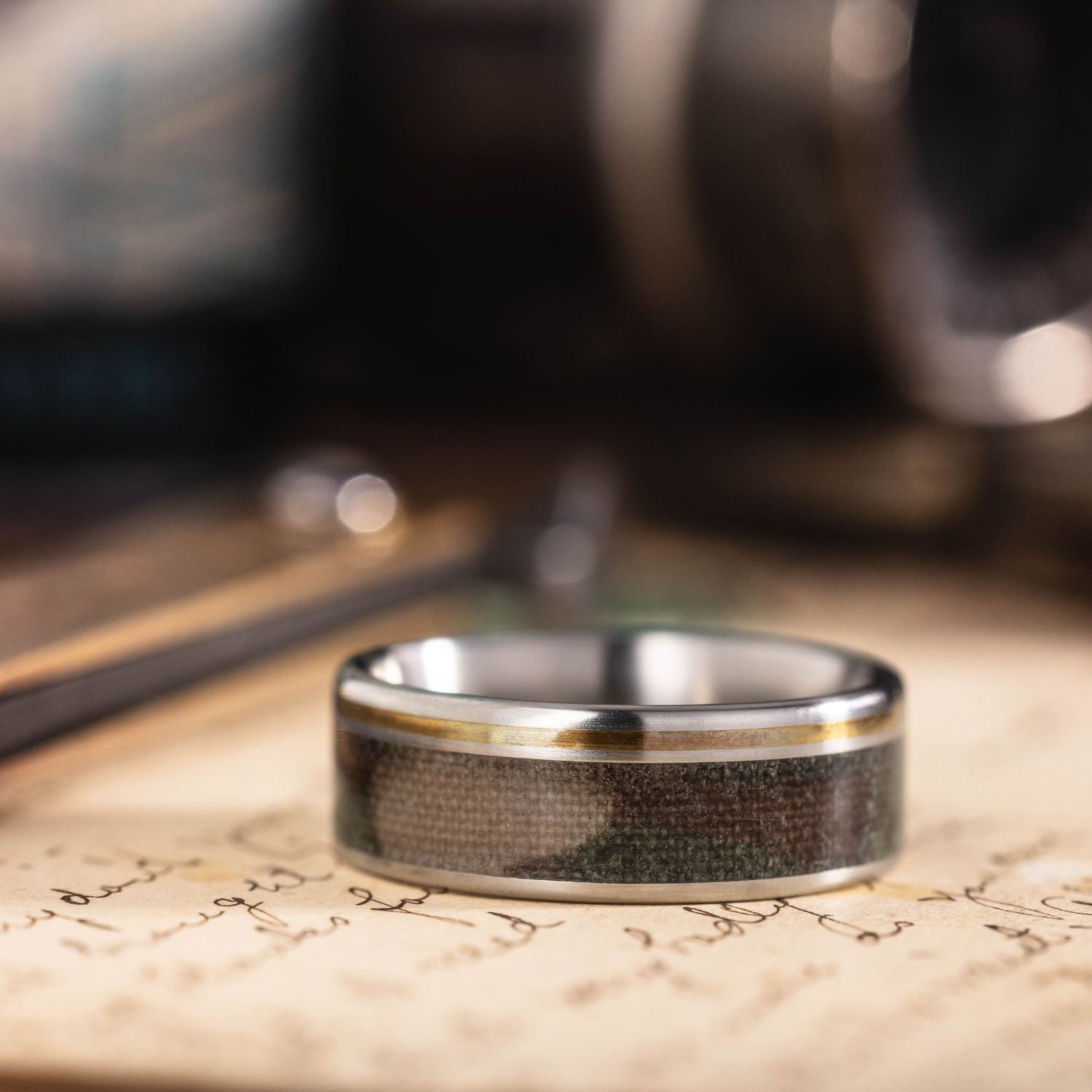 We originally designed this ring with brass to represent the brass ammo used by our soldiers. However, this design pairs well with gold as well.