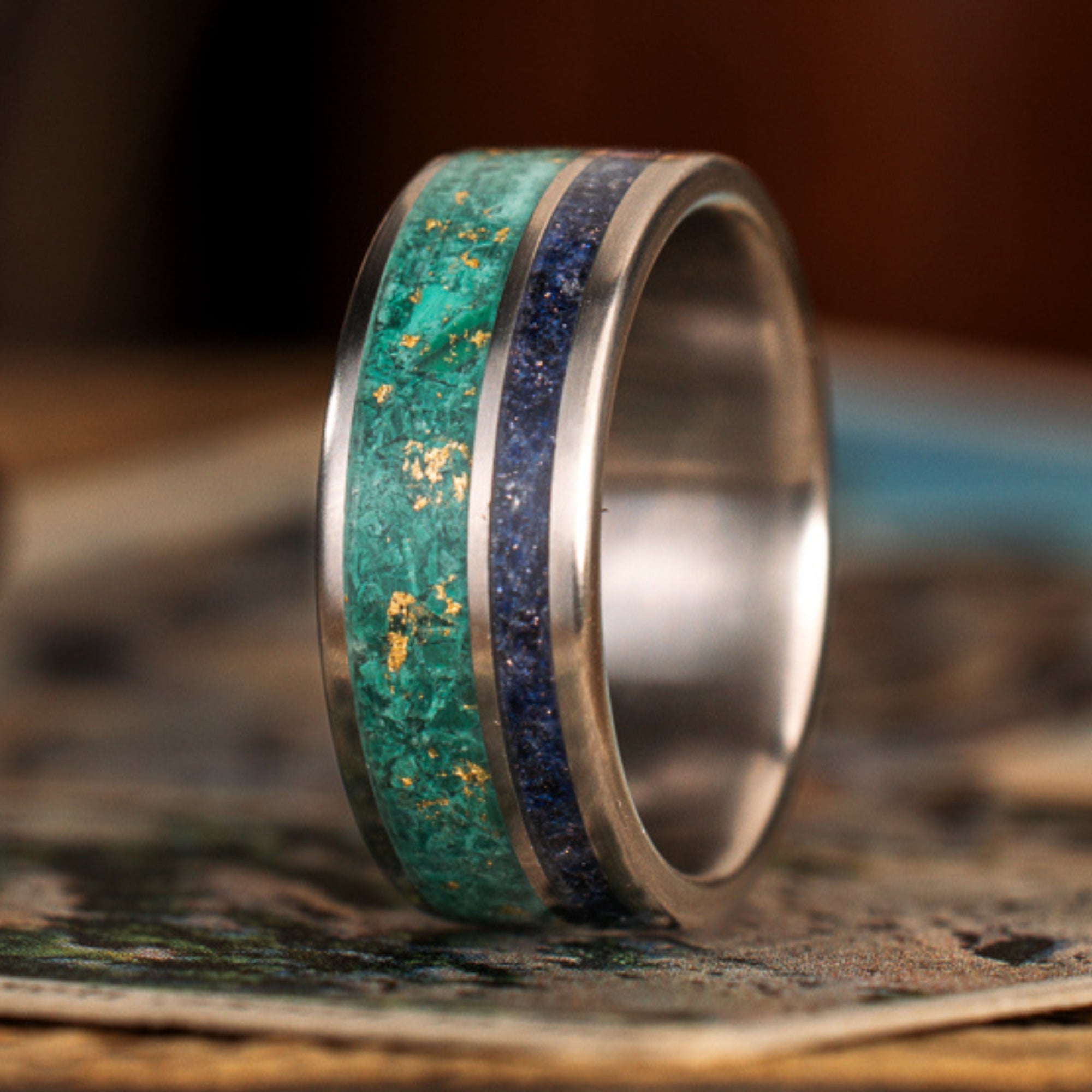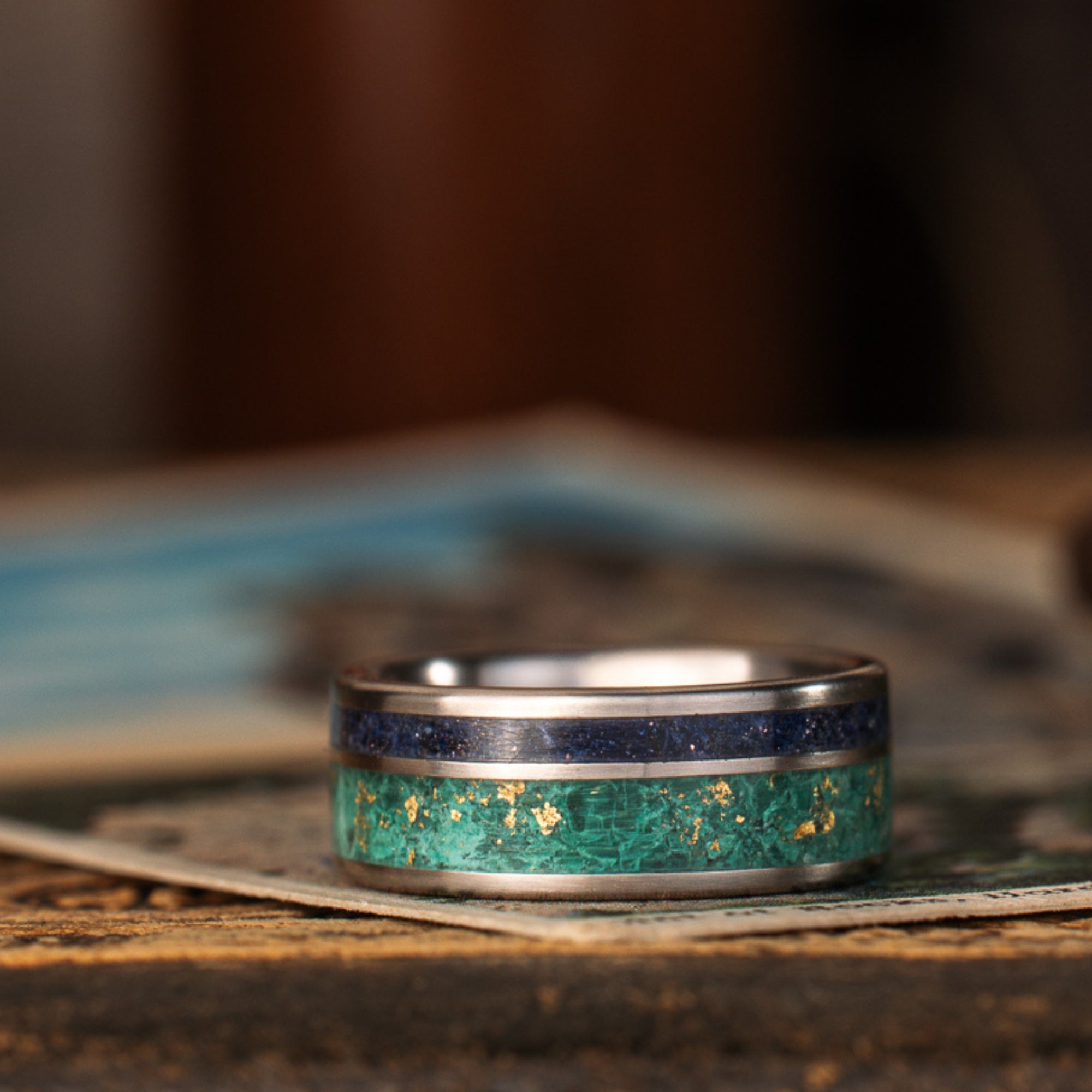 (In-Stock) Custom Titanium Ring with Malachite, Gold Flakes and Blue Goldstone - Size 7.75 | 8mm Wide