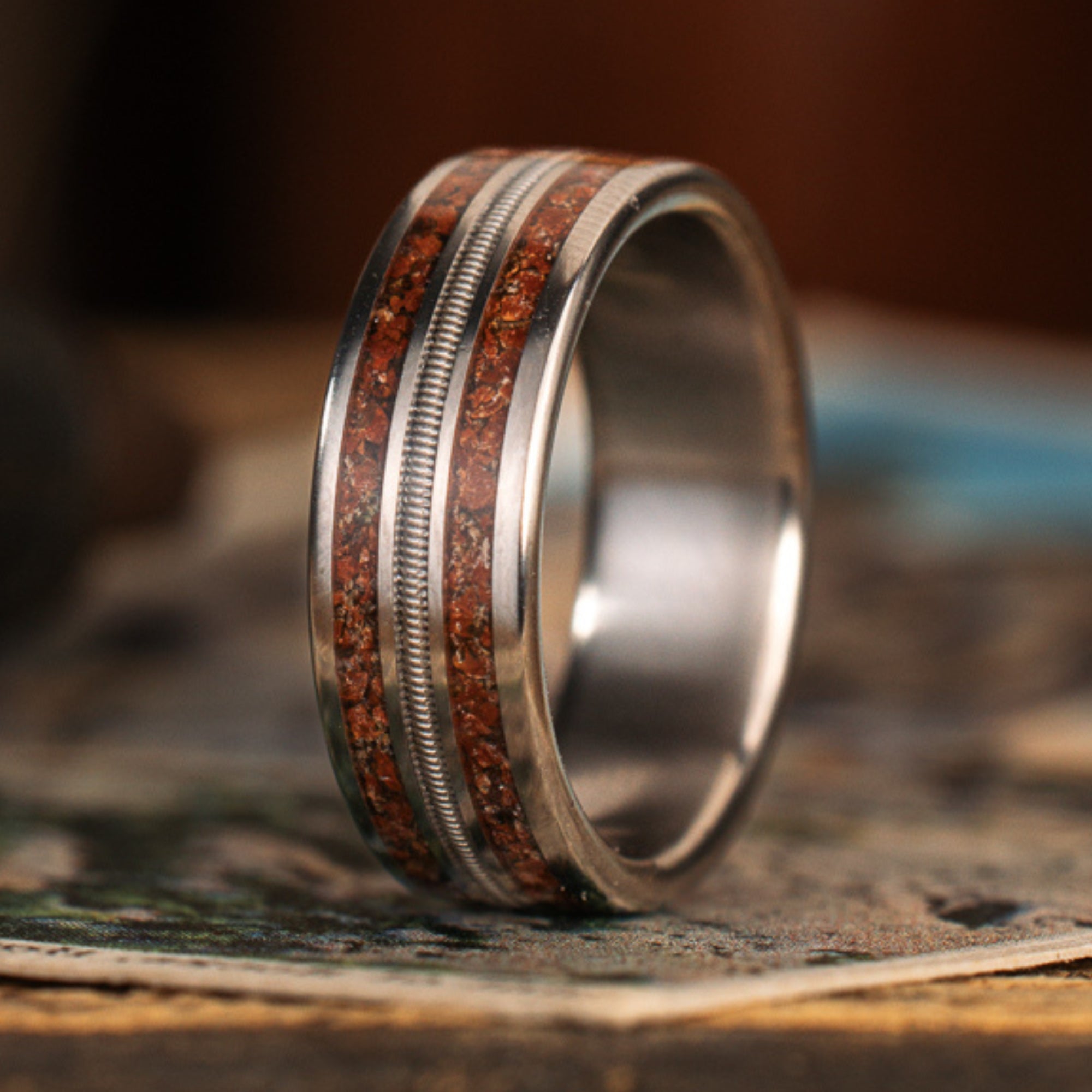 (In-Stock) Men's Custom Titanium Ring with Dinosaur Bone & Guitar String - Size 7.5 | 7mm Wide