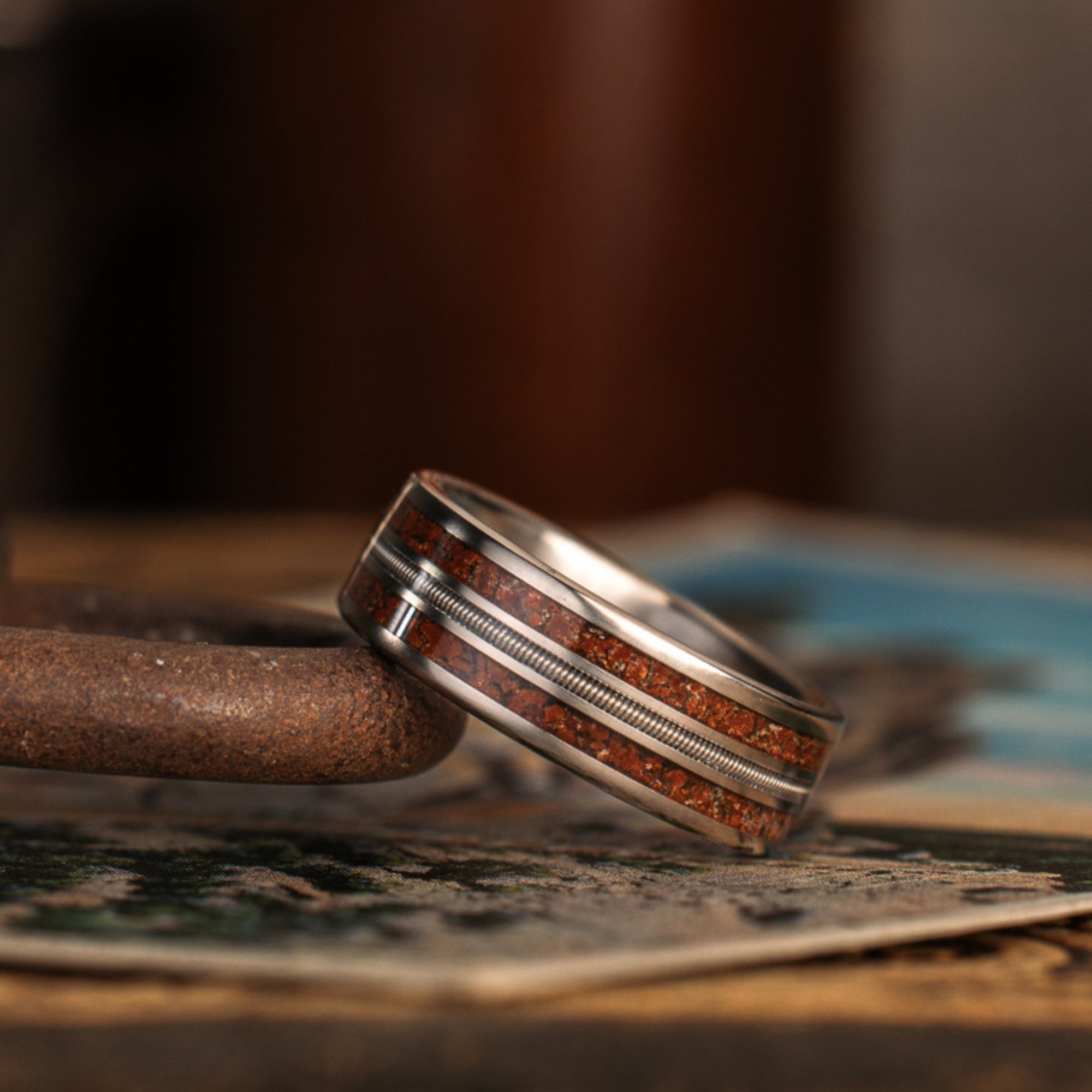 We love how good a nickel guitar string looks in a ring. Nickel has a cooler, more subtle tone reminiscent of a calm, soothing melody that always sets your mind at ease. The string's unique texture adds striking distinction, infusing the design with musicality and showcasing your passion for the arts.