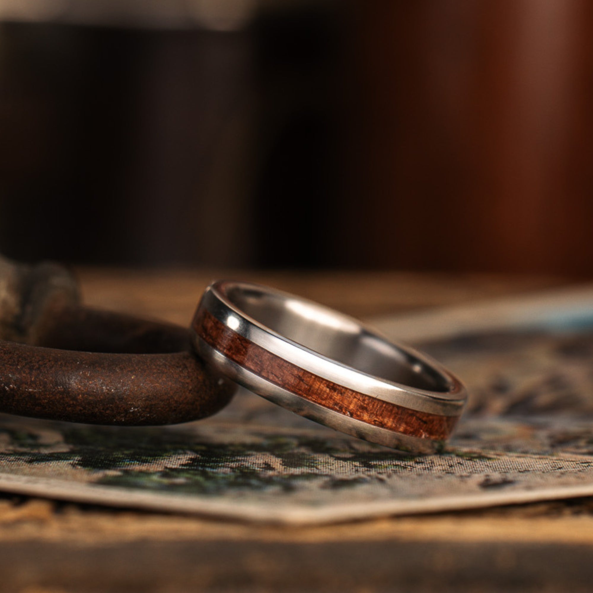 The Garand wedding band: a symbol of our nation's history and the sacrifices made to secure our freedom. With a center inlay of authentic M1 Garand rifle stock wood set in a sleek titanium band, this ring is a tribute to the brave men and women who fought for our country. It's the perfect choice for the man who seeks a timeless and elegant design with a touch of patriotic pride.