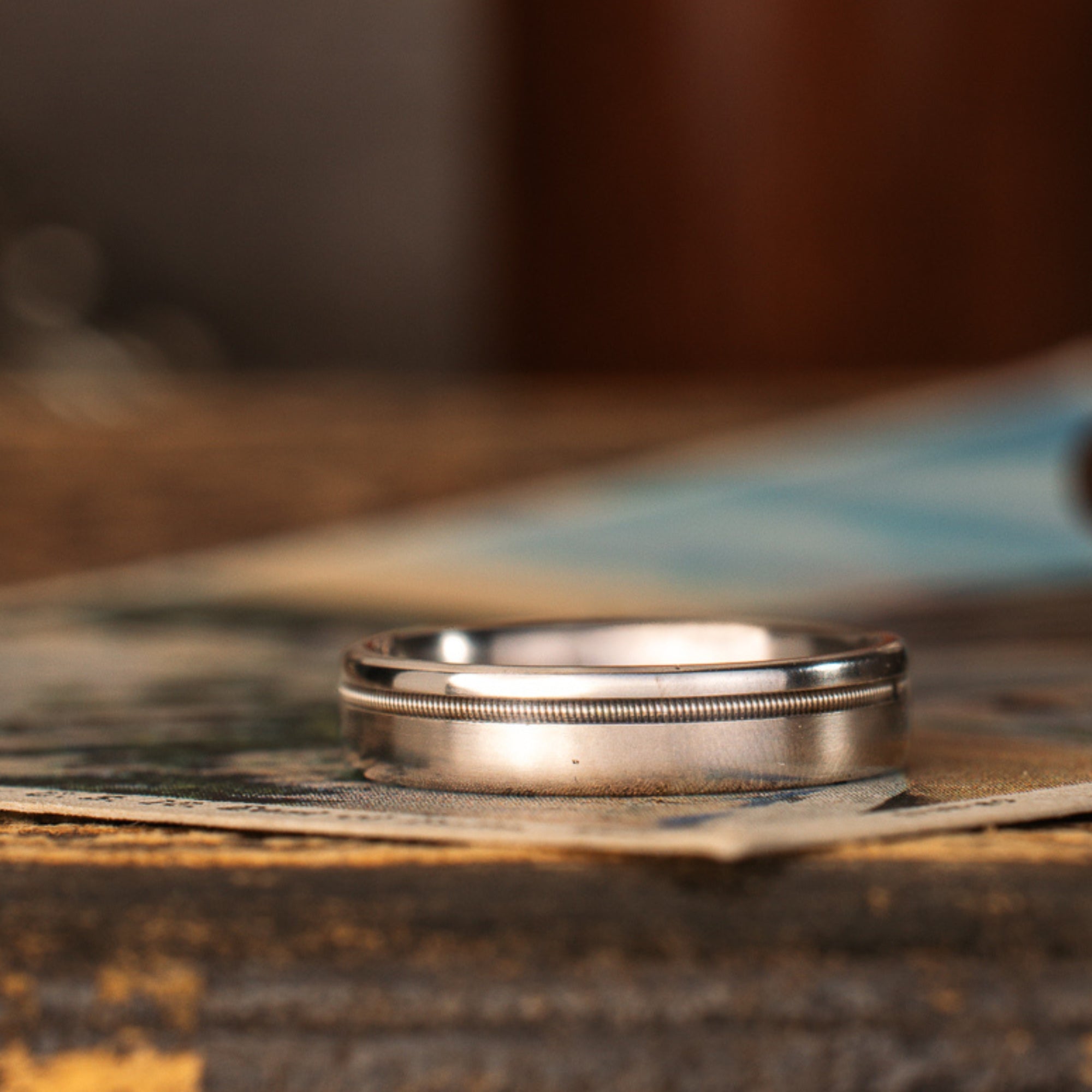 We love how good a nickel guitar string looks in a ring. Nickel has a cooler, more subtle tone reminiscent of a calm, soothing melody that always sets your mind at ease. The string's unique texture adds striking distinction, infusing the design with musicality and showcasing your passion for the art.