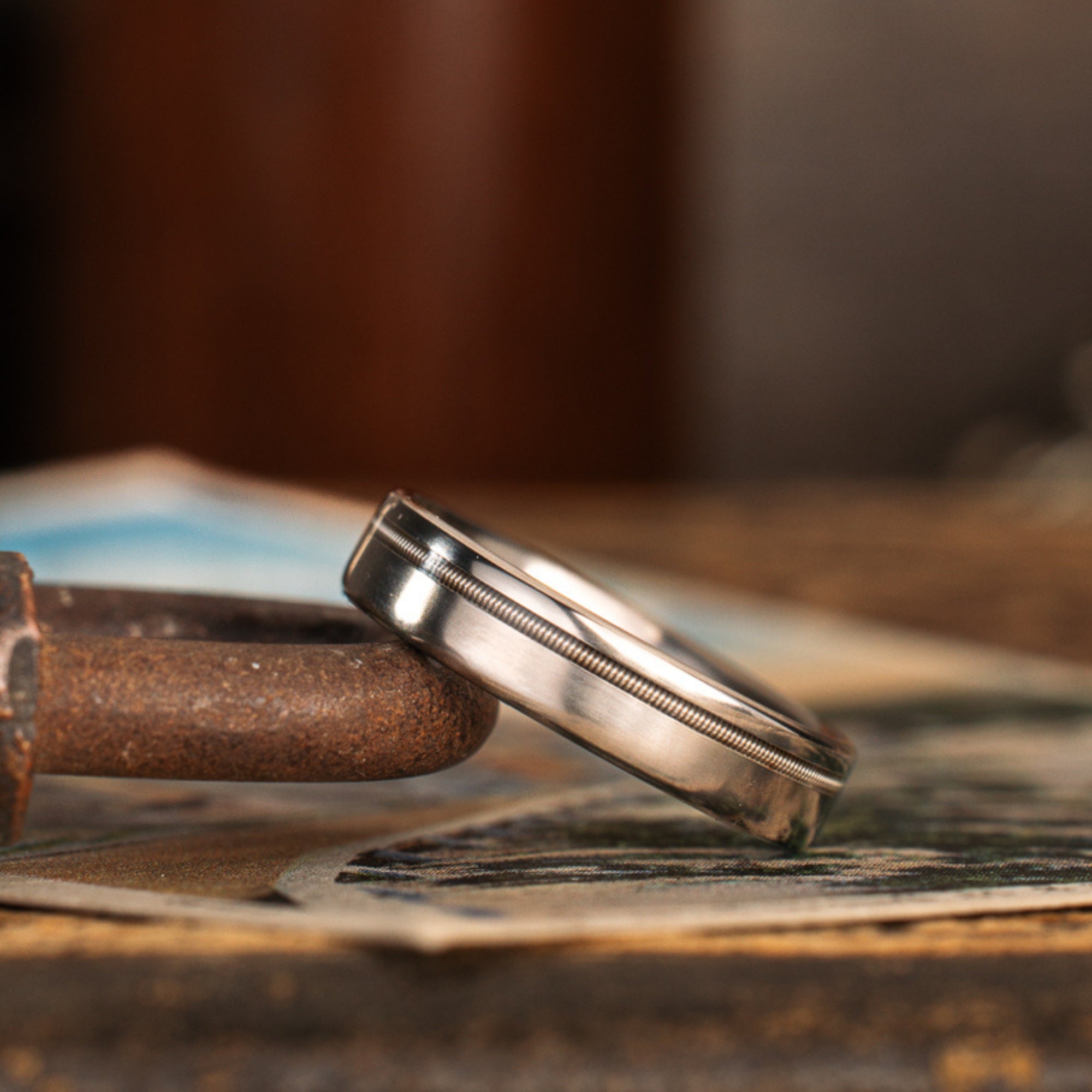 Introducing The Songwriter, a titanium wedding band featuring a unique guitar string inlay. Designed for the passionate musician and creative soul who finds inspiration in melodies and harmonies. Embrace the poetic beauty and artistic spirit of The Songwriter ring, a perfect ode to love and artistic expression.