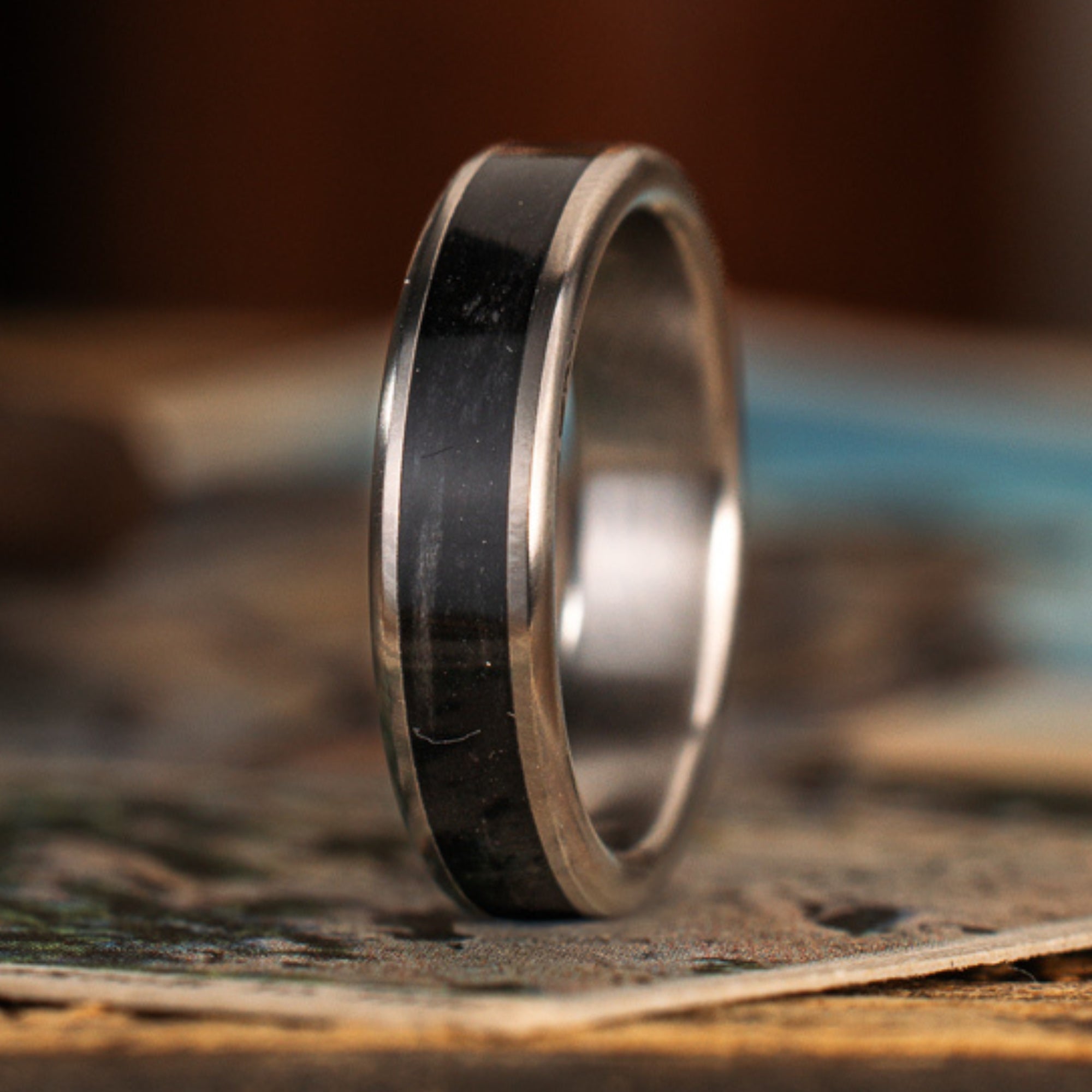 (In-Stock) The Speakeasy | Men's Black Whiskey Barrel Wood & Titanium Wedding Band - Size 7 | 5mm Wide