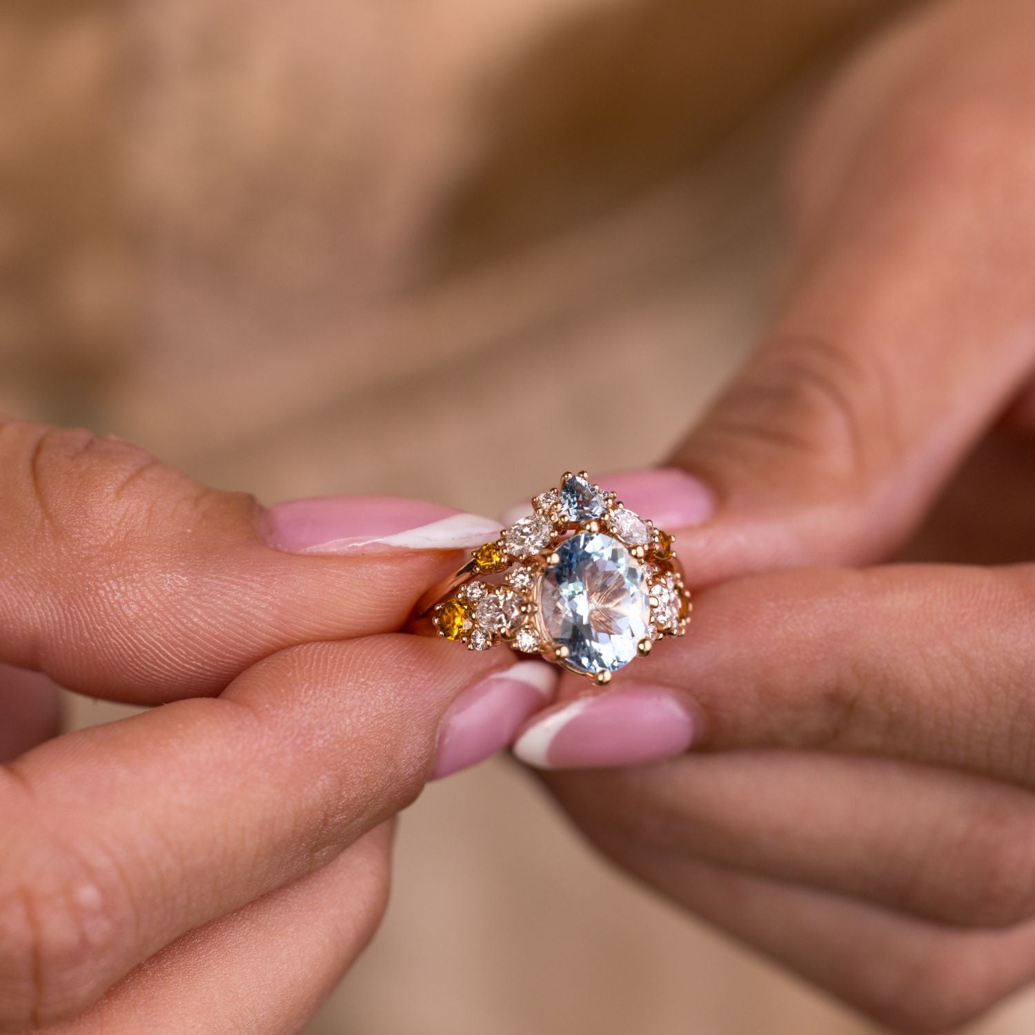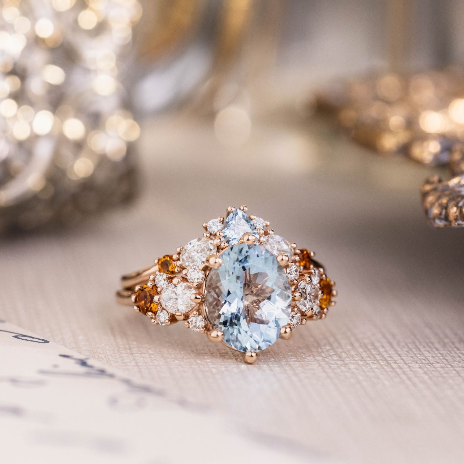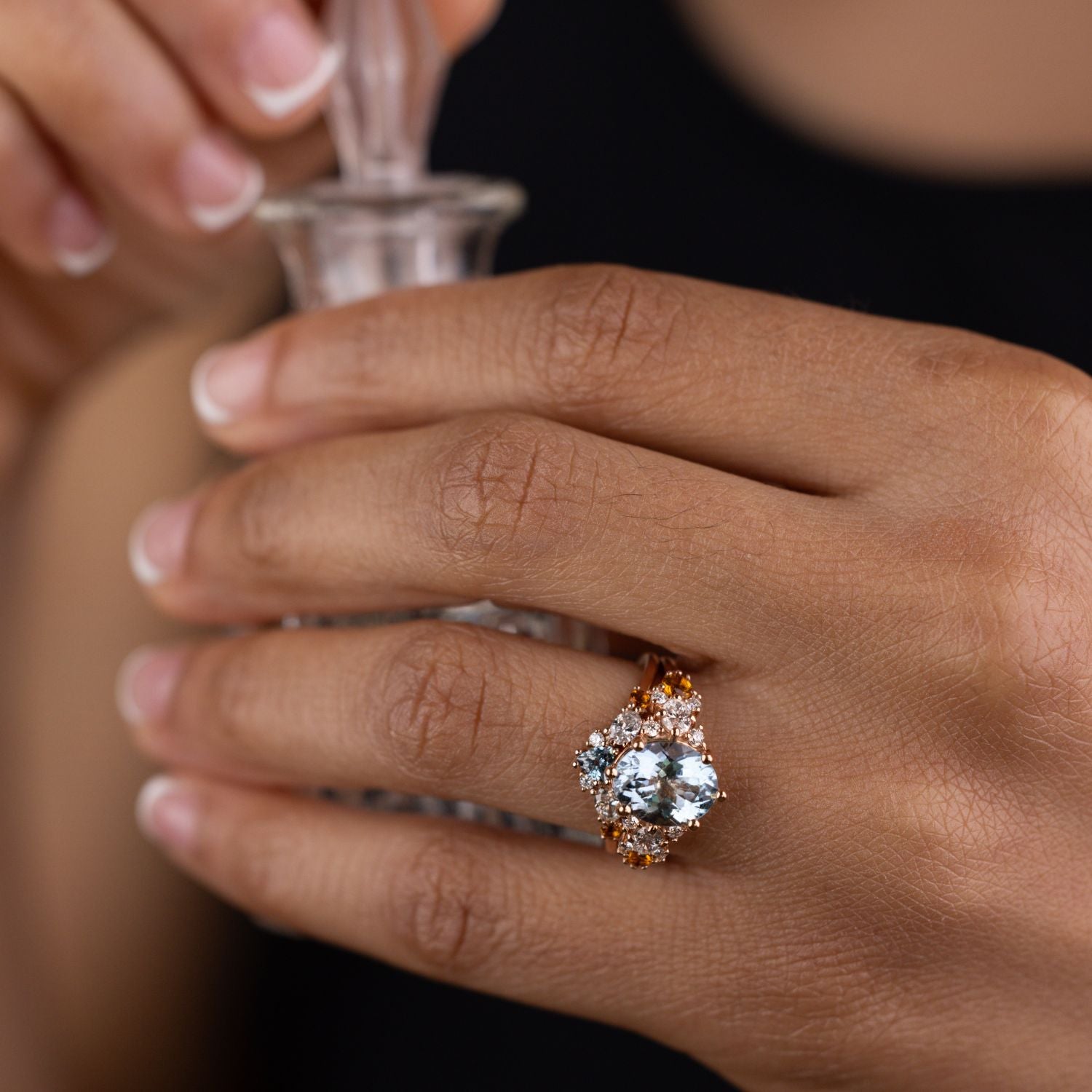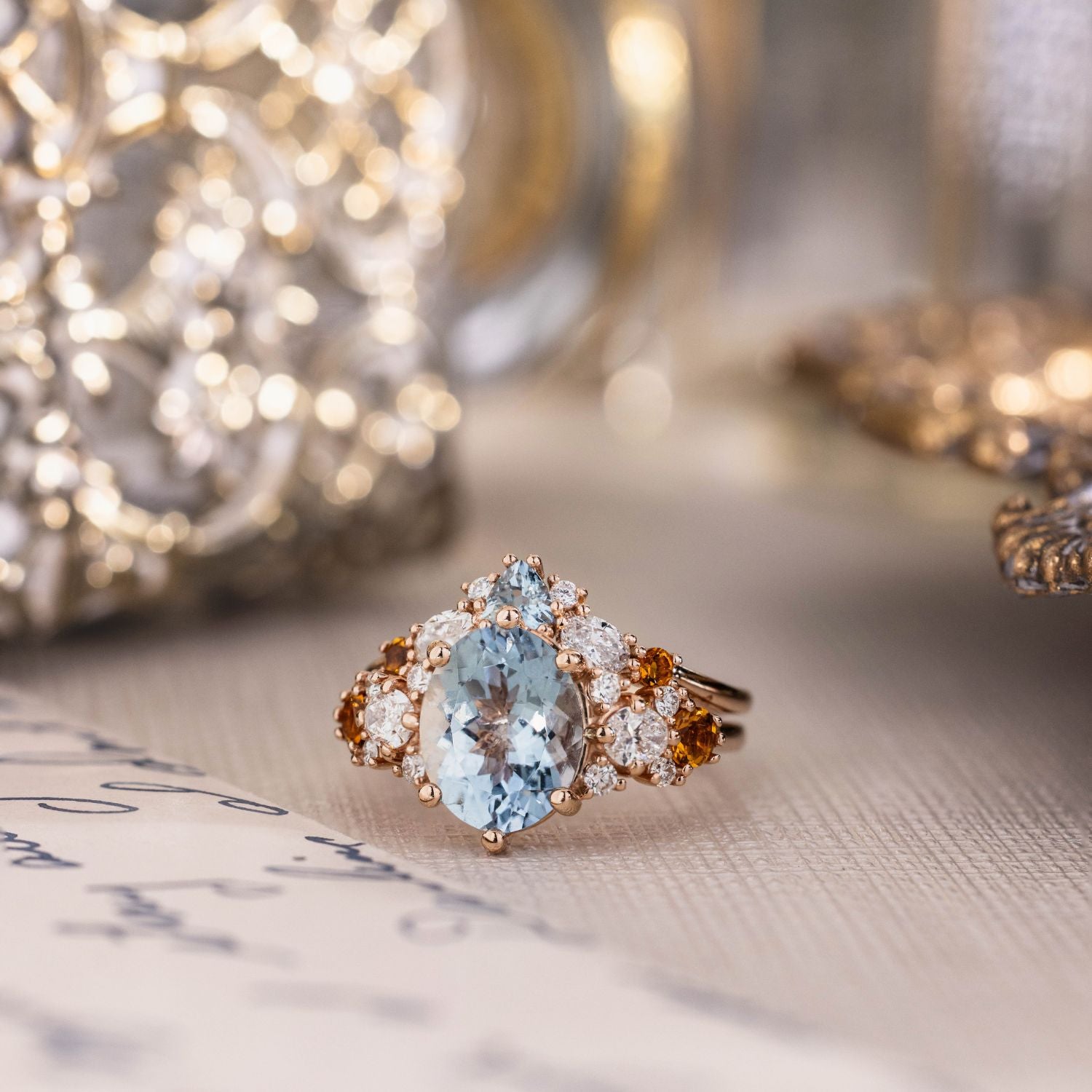 Introducing The Clementine: This vintage-inspired aquamarine contour band is perfect for the bride who appreciates old-world charm in vibrant color. The Clementine is a stunning match for The Elowen engagement ring, featuring matching gemstones of citrine, aquamarine, and glittering diamonds. The two rings stack beautifully together, creating an exquisite set that sparkles in dazzling hues.