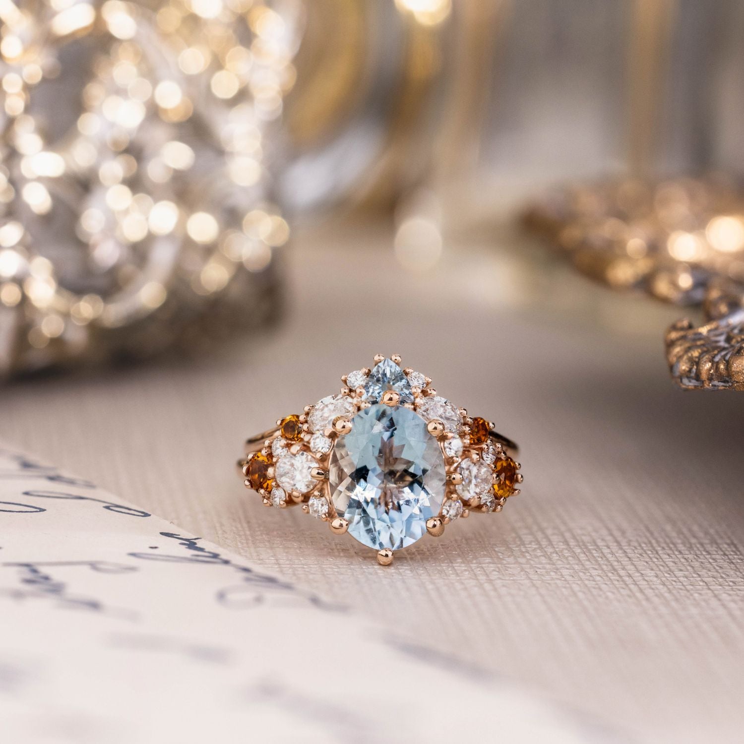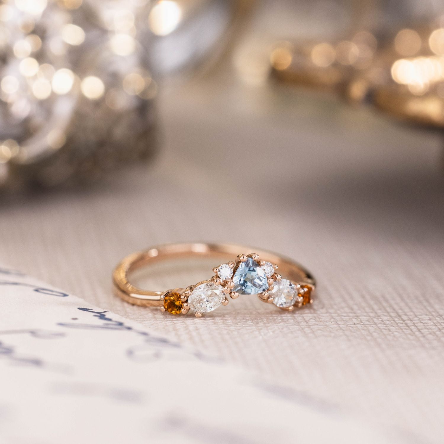 The Clementine - Vintage-Inspired Aquamarine Contour Band with Natural Diamond and Citrine Accents