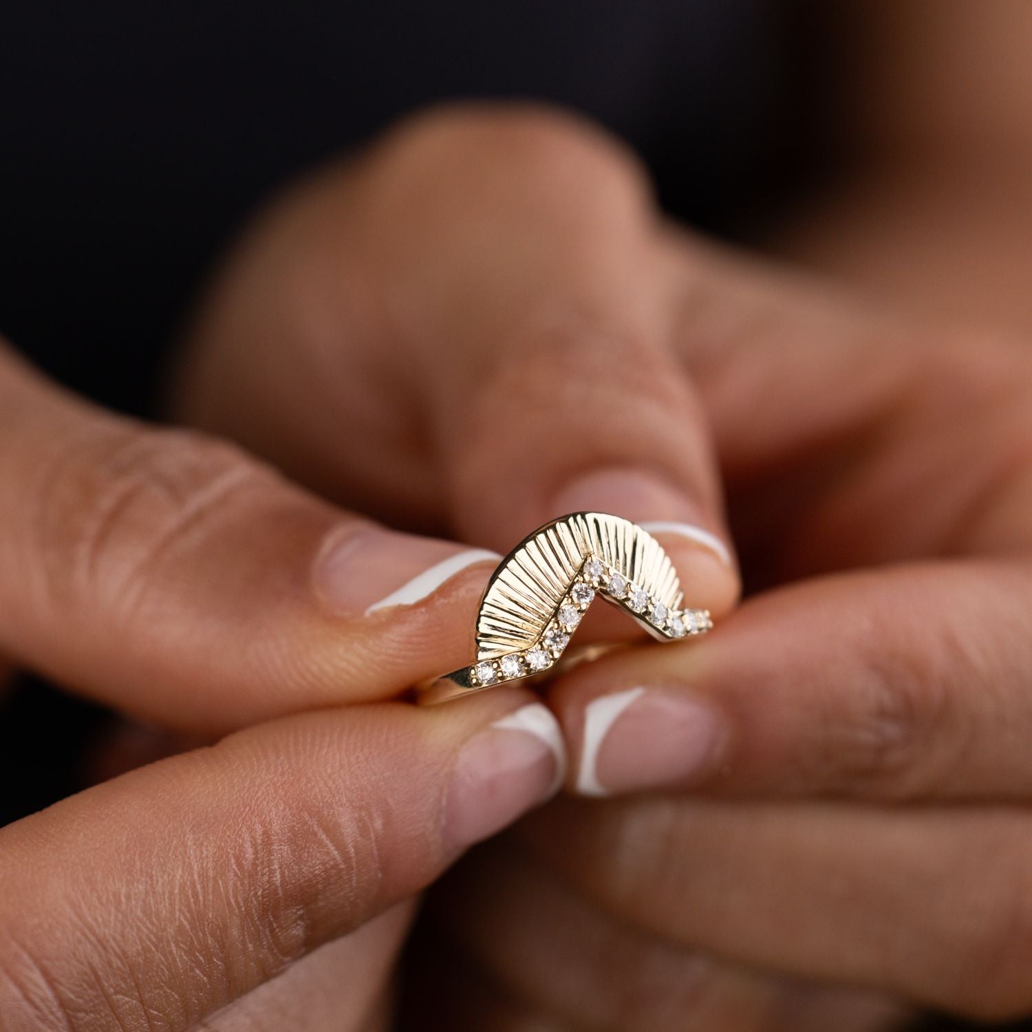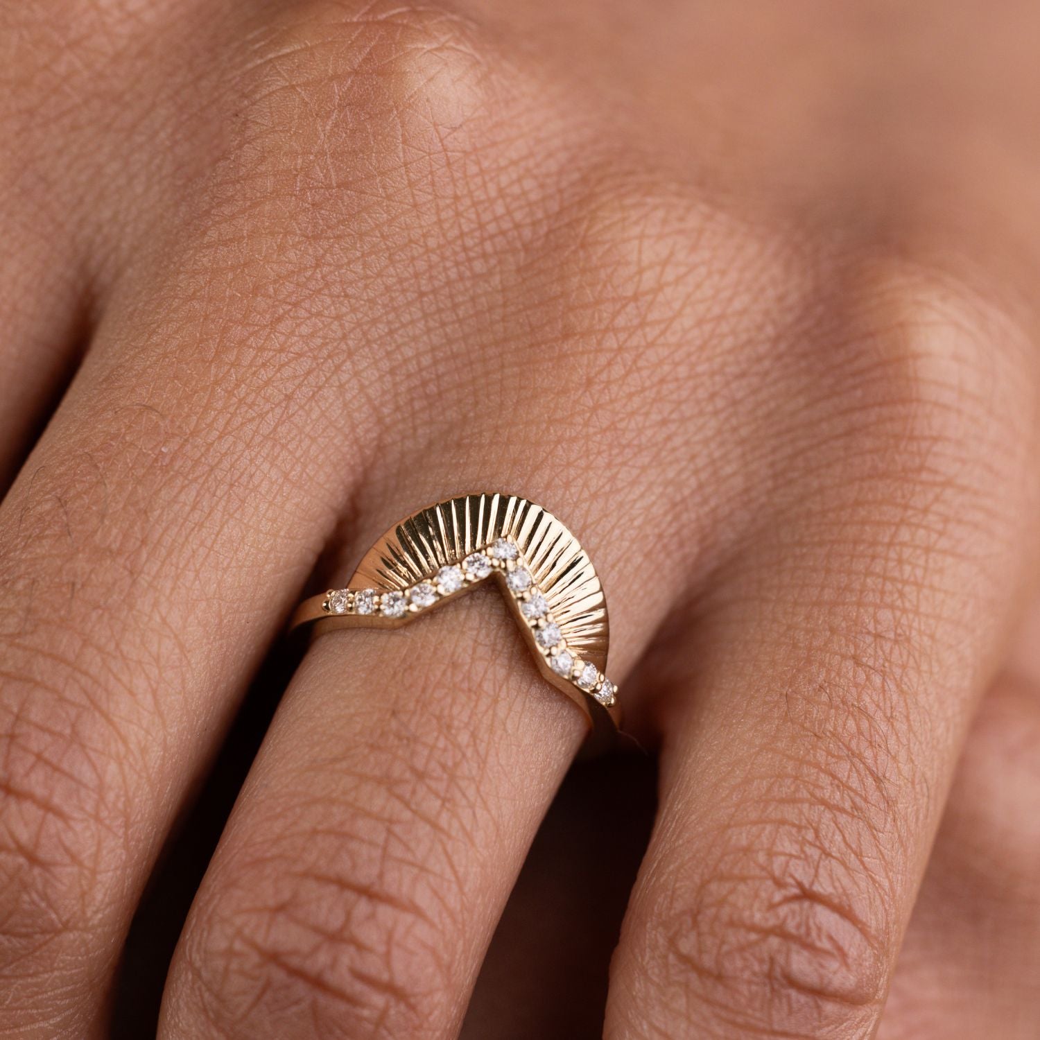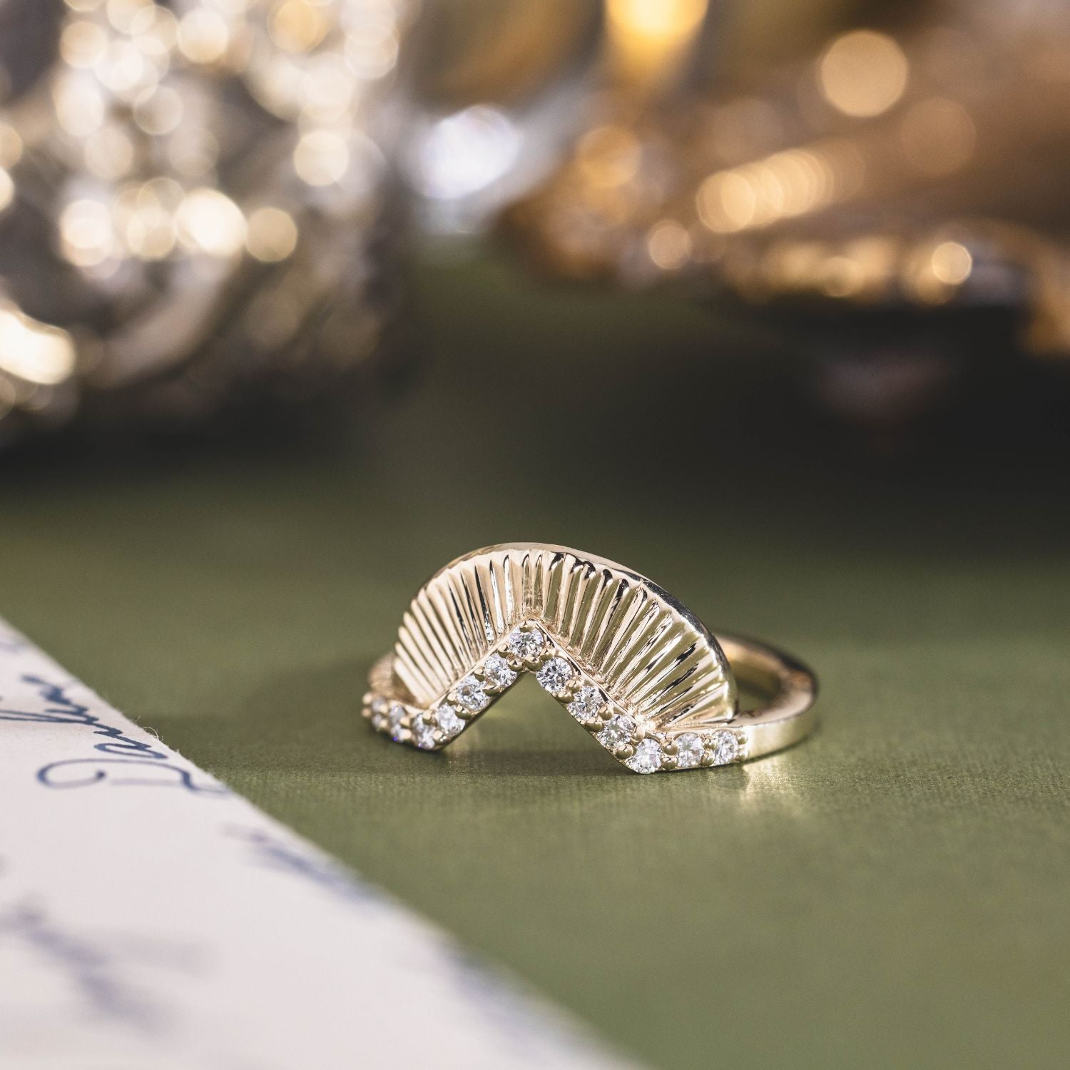 Introducing The Dawn: celebrate the beginning of your new adventure with this striking ring design, which embodies the majestic beauty radiated by the sunrise. Inspired by Art Deco glamour, this striking contour band features a fan-shaped accent with dazzling diamonds. Stacked with The Eileen engagement ring, this v-shaped contour band creates a radiant wedding ring set that tells the story of a powerful, enduring love.