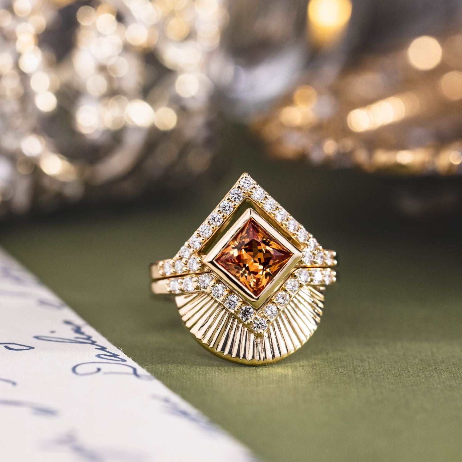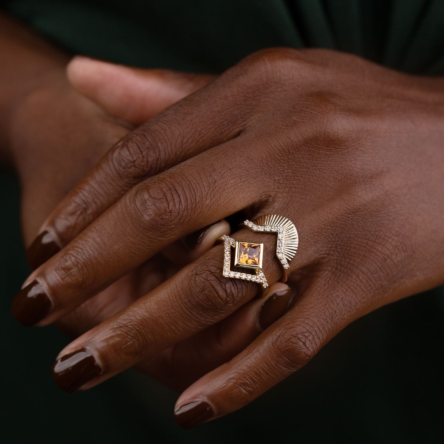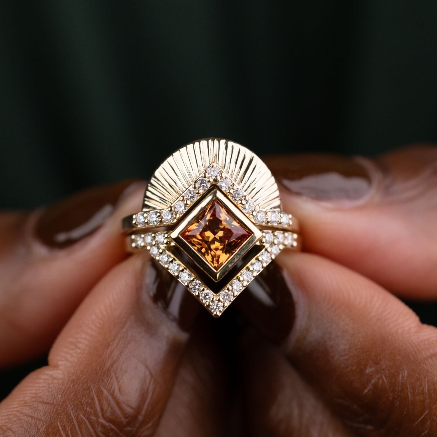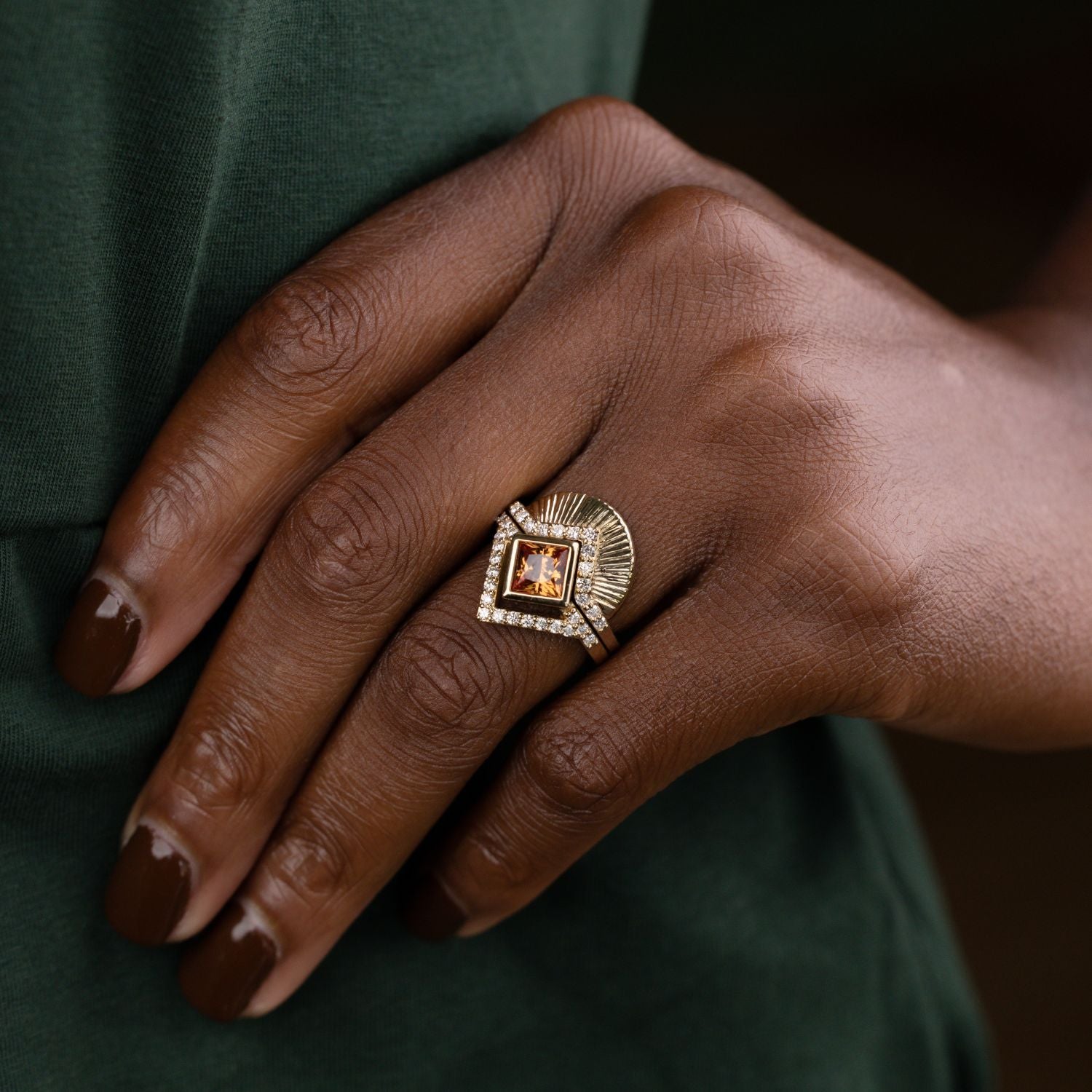 Introducing The Dawn: celebrate the beginning of your new adventure with this striking ring design, which embodies the majestic beauty radiated by the sunrise. Inspired by Art Deco glamour, this striking contour band features a fan-shaped accent with dazzling diamonds. Stacked with The Eileen engagement ring, this v-shaped contour band creates a radiant wedding ring set that tells the story of a powerful, enduring love.